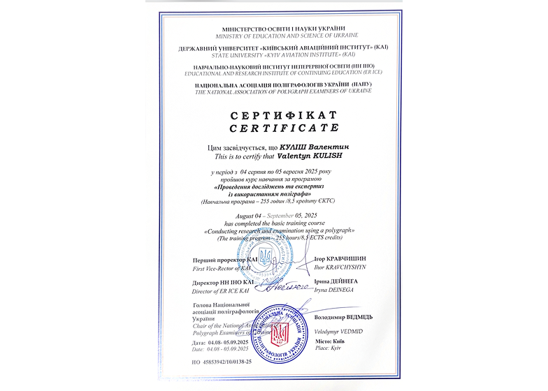 Після закінчення дослідження засвідчую, що претензій до спеціаліста поліграфа та умов проведення дослідження не маю.